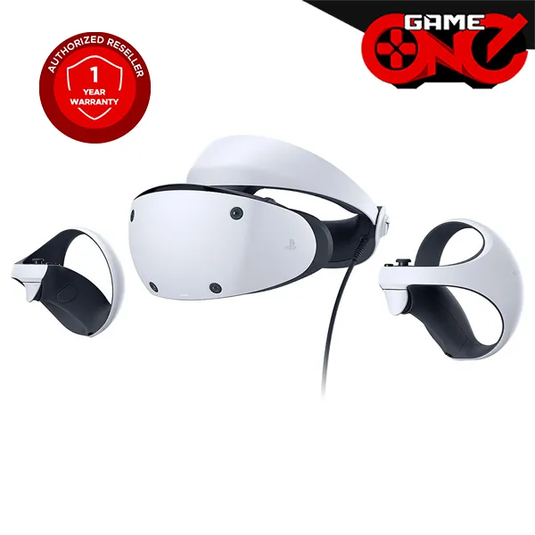 The PlayStation VR2 comes with a 1-year local manufacturer warranty. The package includes the VR headset, PlayStation VR2 Sense controller, USB cable for pairing and charging, stereo headphones, three pairs of earpieces, and printed materials.